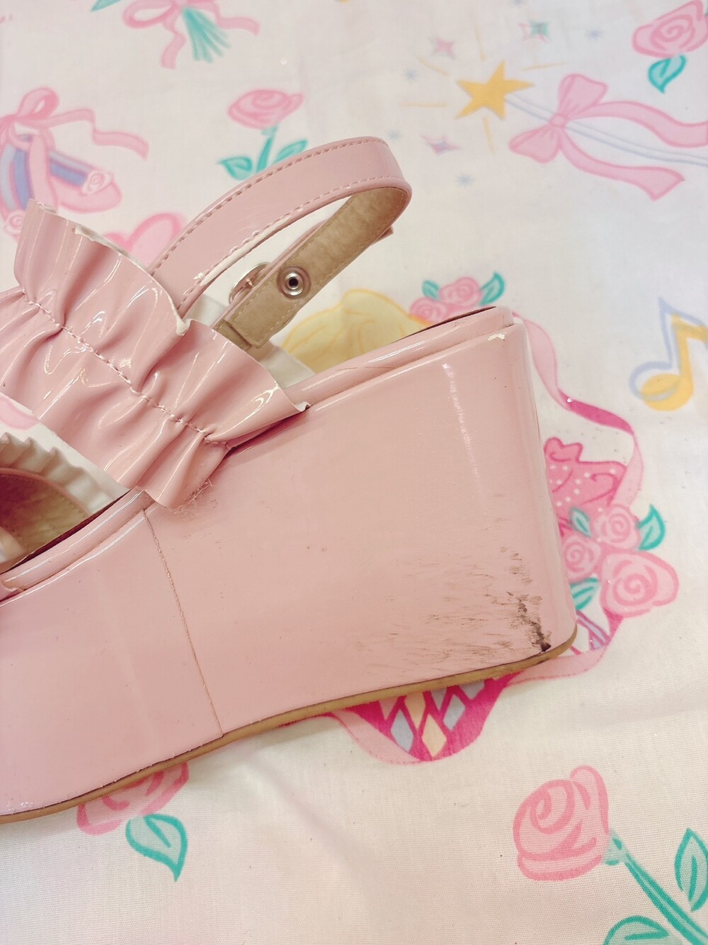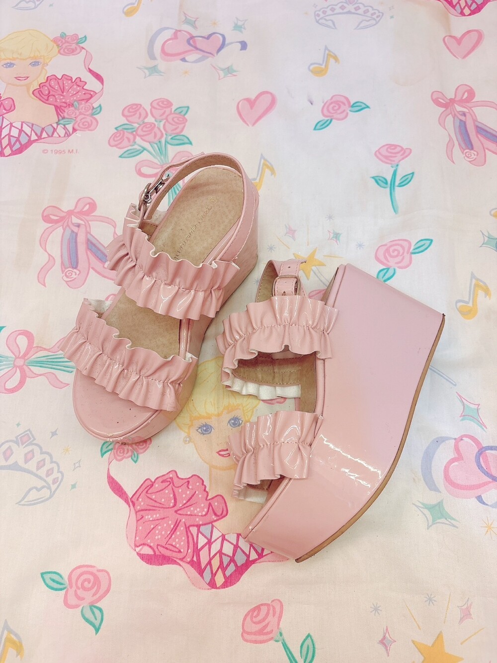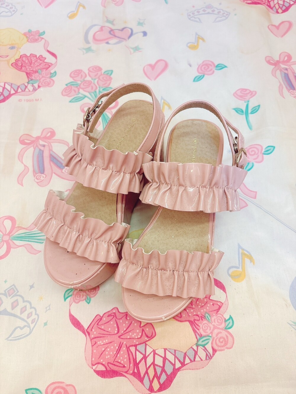 여름에 신기 좋은 에나멜 소재에 프릴이 달린 플랫폼 샌들🎀
