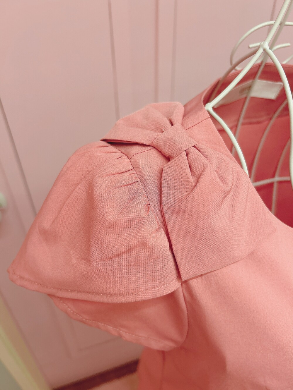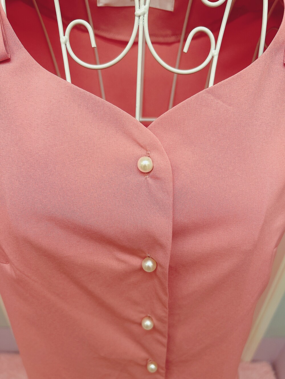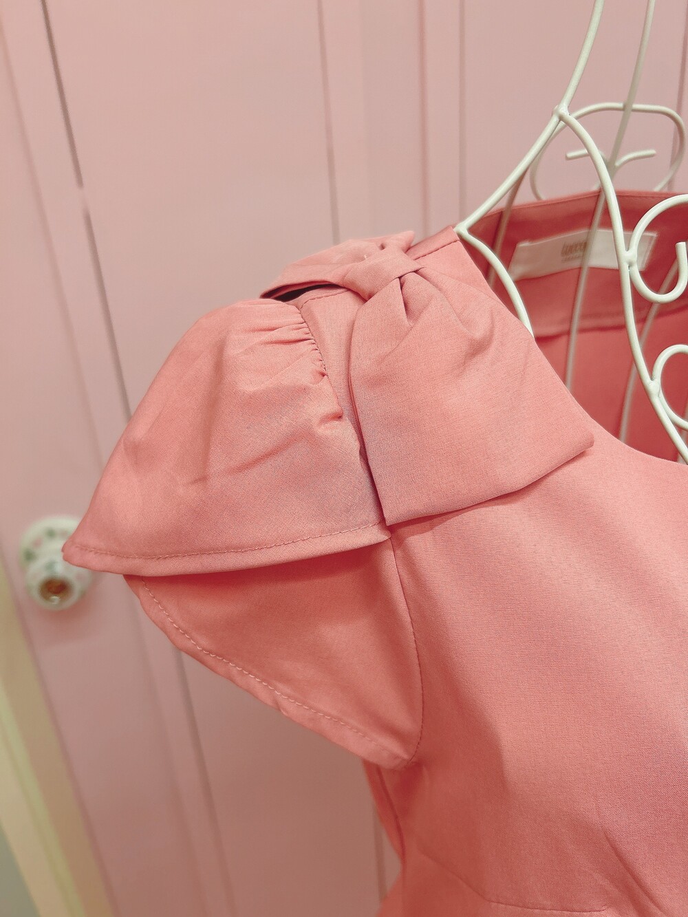 코랄 핑크컬러에 넥라인과 진주 콩단추가 여성스럽고 성숙한 분위기를 주면서도 어깨에 리본 디테일이 사랑스러운 디자인🎀