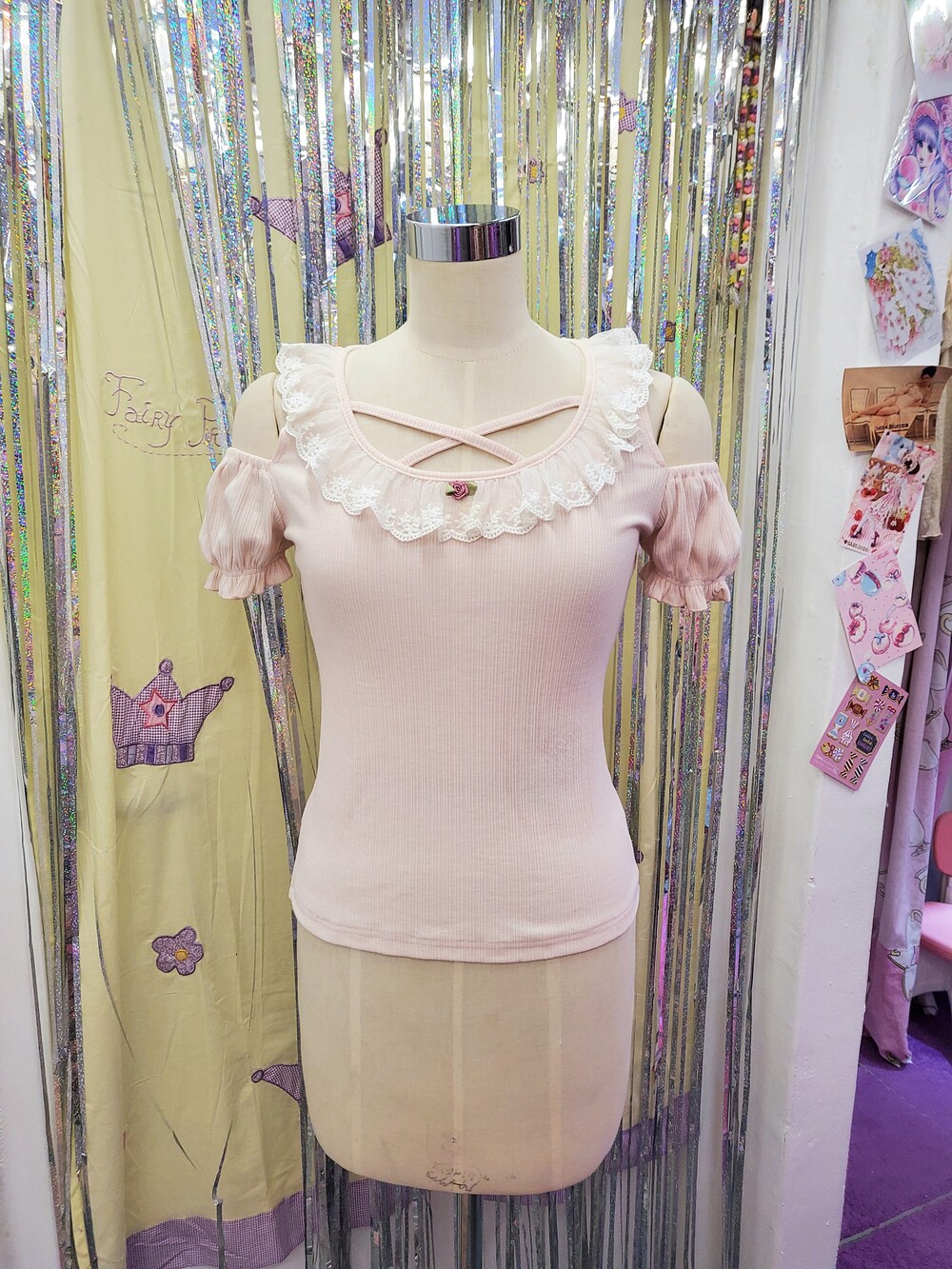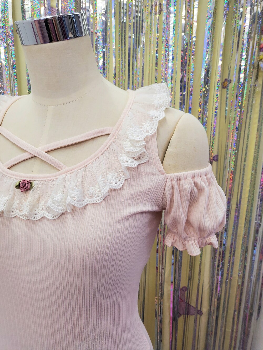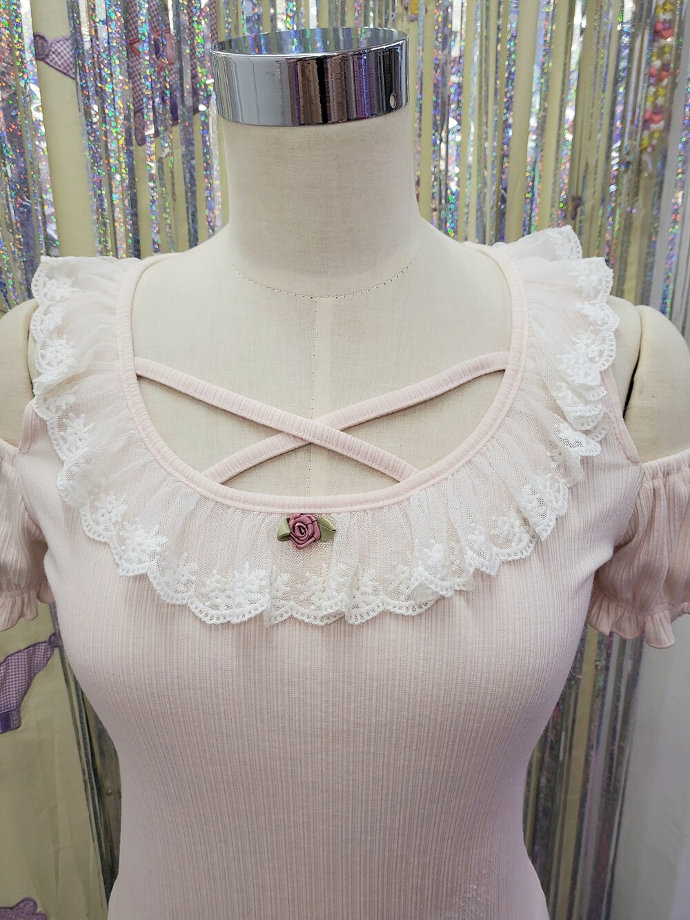 레이스 프릴과 로즈장식과 함께 크로스되는 스트랩이