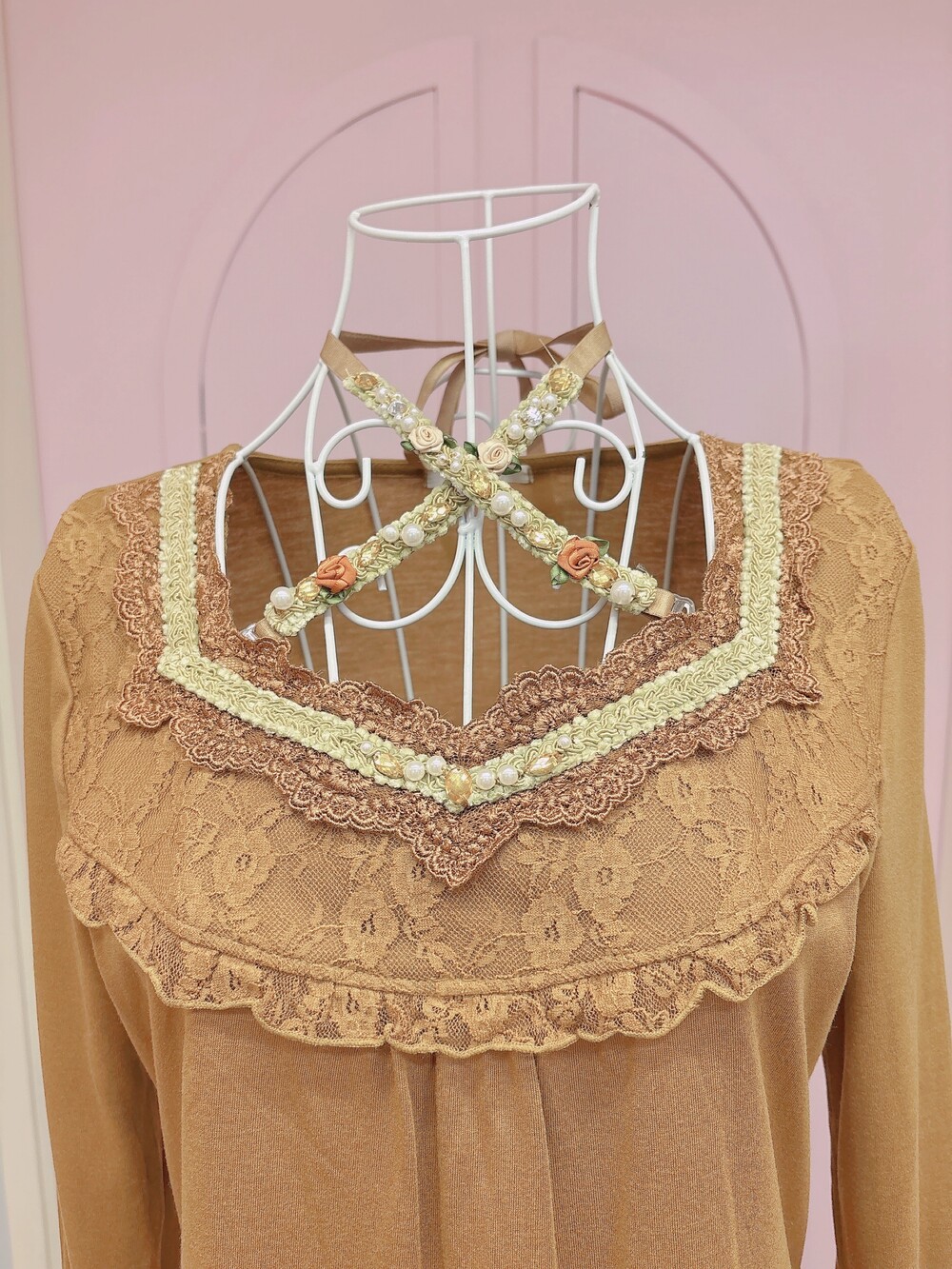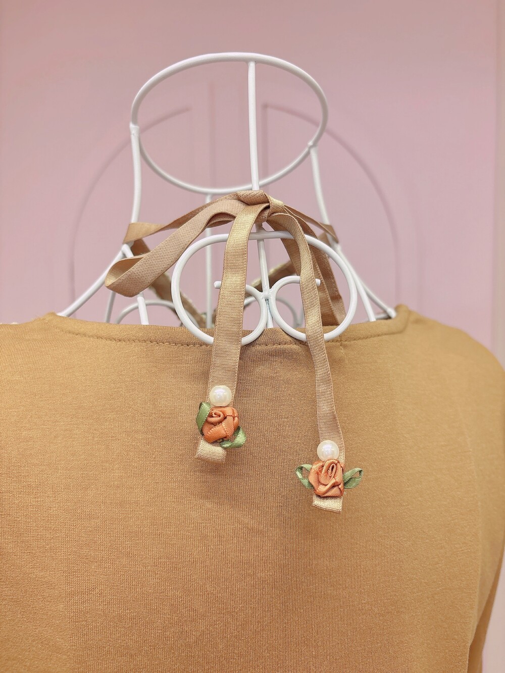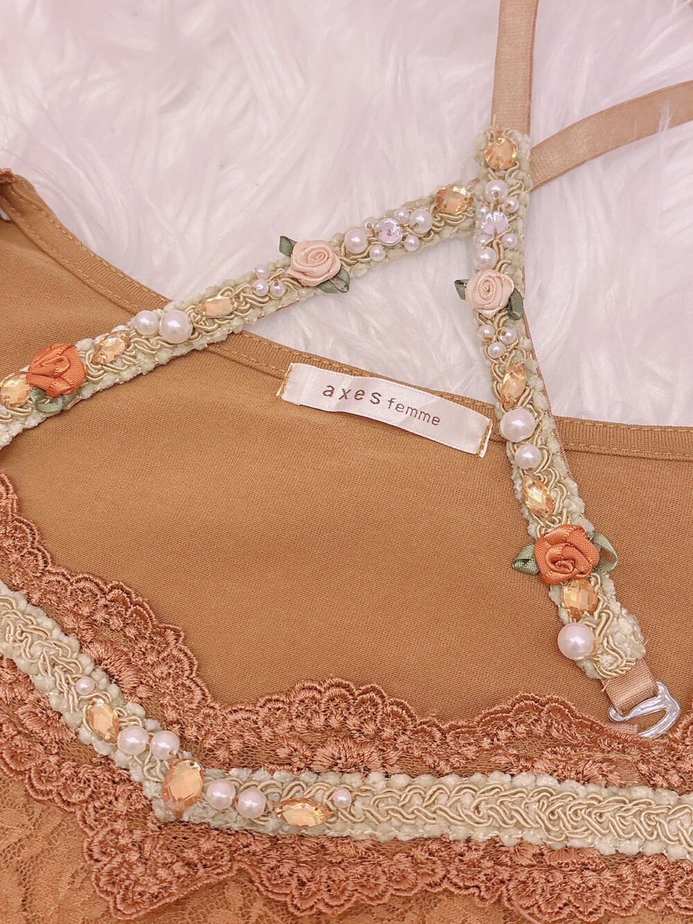 액시즈팜 브랜드 특유의 레이스 디테일과 스트랩의 꽃과 진주와 큐빅장식들이 조화롭게 믹스되어 있는 예쁜 디자인의 긴소매 탑이에요💐
