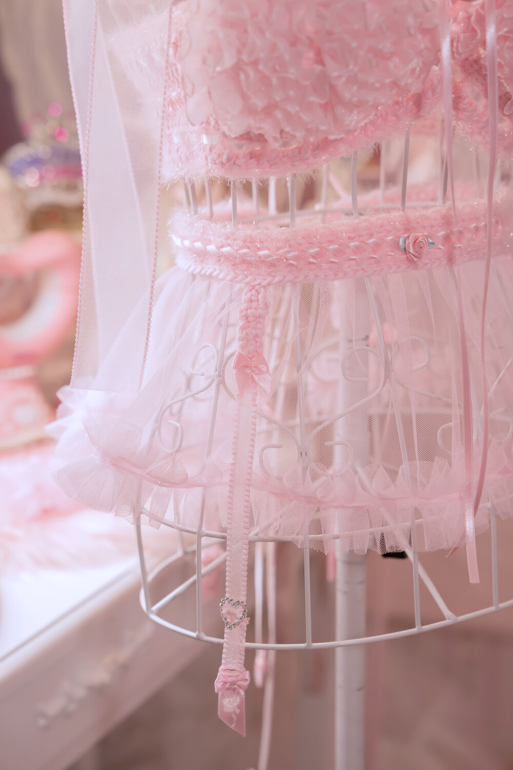 ♥ 코튼, 모헤어, 글리터 3가지 종류의 실로 제작된 크로셰 핸드 니팅 베이스에 레이스, 오간자, 리본 디테일들이 듬뿍 담겨 있는 올 핸드메이드 상품입니다.